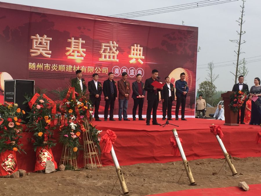 4月14日上午,隨州市炎順建材有限公司項目奠基儀式于隨縣新經(jīng)濟開發(fā)區(qū)新項目建設(shè)基地隆重舉行,炎順瓦業(yè)公司董事長劉永德,總經(jīng)理劉炎、衡陽炎順瓦業(yè)公司總經(jīng)理劉永才、總監(jiān)陳月棟,泉州炎順瓦業(yè)公司總經(jīng)理劉歡、總監(jiān)劉東方以及公司運營部、財務(wù)部、研發(fā)部、廠區(qū)、質(zhì)保部等相關(guān)負責人攜全體員工共同參加了本次儀式,同時蒞臨奠基儀式的嘉賓有隨縣政府的副縣長,江蘇波美特瓦業(yè)有限公司宋總攜夫人等考察團一行。 據(jù)相關(guān)資料顯示,炎順集團隨州基地概況:占地面積:40畝、投資金額:1億5000萬、工廠面積:1萬平方米、辦公樓面積:2800平方、住宅樓面積:2800平方、就業(yè)人員:200人、年產(chǎn)值:1.2億元人民幣。
